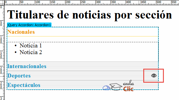 Modificar el título de cada sección es tan simple como hacer clic en la palabra Sección y escribir el título deseado. Dotar de contenido al widget depende de la vista con la que estemos trabajando. En la vista Diseño de Dreamweaver, el primer panel está abierto, con lo que podemos escribir el contenido, insertar imágenes, etcétera. Cuando pasamos el cursor sobre el título del resto de las secciones, aparece un icono en el que hay que hacer clic para que el panel correspondiente se abra y podamos, por tanto, trabajar con su contenido.