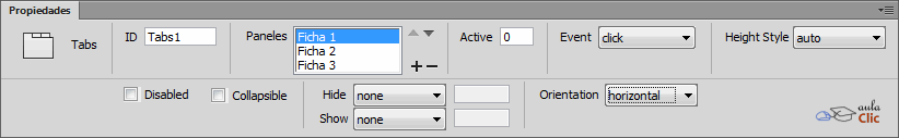 En realidad, son muy similares a las de Accordion: Paneles permite aumentar o disminuir el número de fichas, así como reorganizarlas. Active permite establecer la ficha activa. Event determina si funciona con un clic o pasando el cursor sobre la ficha para que muestre su contenido. Height Style determina cómo debe ajustar su tamaño de acuerdo a su contenido. Las casilla Disabled desactiva su funcionamiento. Hide y Show permiten configurar la animación con la que va a aparecer u ocultarse el contenido de cada ficha y el tiempo de cada efecto.