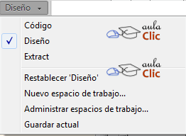 Más hacia la derecha observamos el conmutador del espacio de trabajo, como un desplegable. Un espacio de trabajo es la configuración del entorno (paneles visibles y su disposición) que podemos guardar y cargar. Lo veremos más adelante, en tanto, ésta es su imagen desplegado.