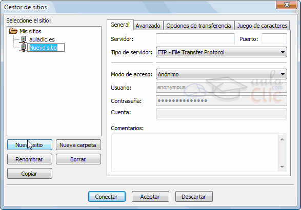 Una vez instalado, abre el programa y haz clic en Archivo → Gestor de sitios y luego en Nuevo sitio para configurar un nuevo sitio FTP.