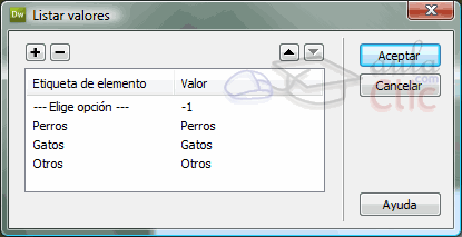 - En el panel Propiedades haz clic sobre el botón Valores de lista y rellena el cuadro de diálogo para que se muestre de la siguiente forma: