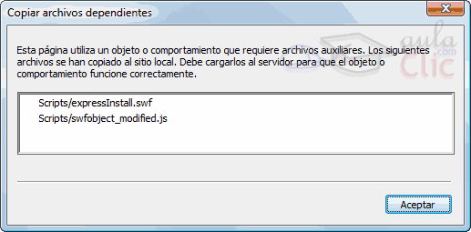 Al insertarse animaciones Flash, es frecuente que Dreamweaver añada algunos archivos que nos permitirán reproducir los elementos, normalmente creando la carpeta Scripts. Es importante incluir esta carpeta cuando publiquemos nuestro sitio, si no los archivos no se verán. De todas formas, Dreamweaver nos avisará cuando incluya archivos.