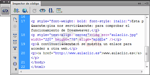 El Inspector de código muestra el código HTML de la misma forma que lo hacen la vista Código y la vista Dividir (Código y Diseño), pero puede resultar más cómodo trabajar con el panel, ya que puede situarse en cualquier parte de la pantalla, y no se limita sólo al espacio del documento. Por ejemplo, si disponemos de una pantalla panorámica, podemos tener a un lado el diseño y a otro el código.