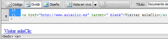Imaginemos que deseamos introducir en nuestra página un enlace a la página de aulaclic, que ha de abrirse en una ventana nueva. En este caso deberíamos introducir la etiqueta <a href="http://www.aulaclic.es" target="_blank">Visitar aulaClic</a>, con lo que obtendríamos el siguiente enlace:
