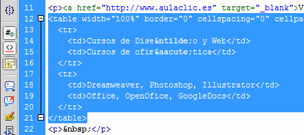 Por ejemplo, podemos seleccionar el trozo de código correspondiente a una tabla, como se ve en la siguiente imagen, aunque podemos seleccionar cualquier código: