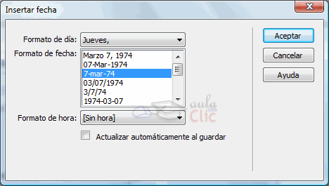 Cuando se modifica una página en la que se ha insertado este tipo de fecha, se actualizará automáticamente con la fecha del sistema.