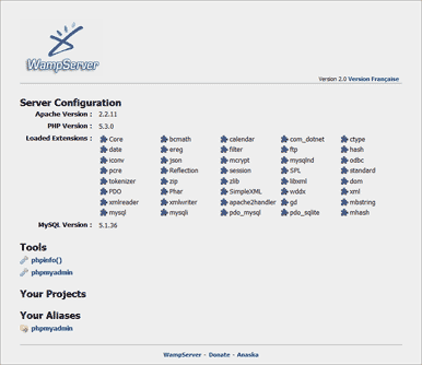 Verás que una vez instalado WAMP podremos acceder a nuestro servidor local escribiendo en la barra de direcciones del navegador http://localhost/. Se mostrará una pantalla parecida a ésta, con información sobre la versión: