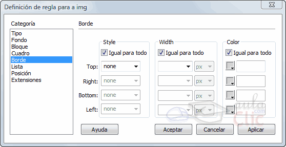 En ella, seleccionamos la categoría Borde, y en Style seleccionamos none. Pulsamos Aceptar.