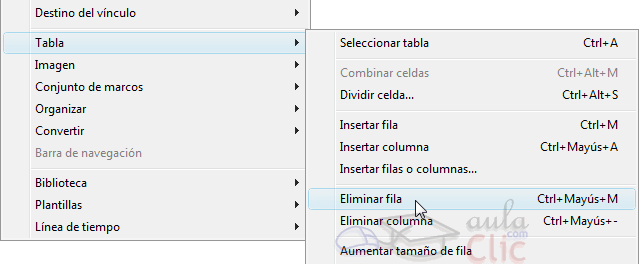 Para eliminar una fila o una columna, hay que posicionar el cursor en la fila o columna a eliminar y elegir la opción Eliminar fila o Eliminar columna del menú Tabla.