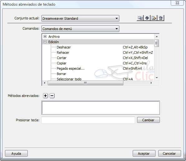 Los métodos abreviados de teclado son las combinaciones de teclas que permiten acceder a algunas opciones sin la necesidad de moverse a través de los menús. Para modificar las combinaciones de teclas hay que dirigirse al menú Edición, a la opción Métodos abreviados de teclado.