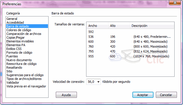 Una vez establecida una velocidad de conexión, y aceptados los cambios, Dreamweaver calculará el tamaño y el tiempo de descarga de la páginas a partir de esa velocidad de conexión.