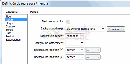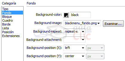- En Fondo, cambiamos la imagen de fondo (background-image) a blackmenu_pulsada.png.