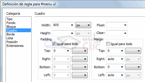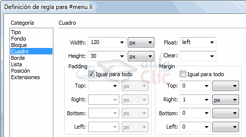 - Hemos cambiado las siguientes propiedades: En la categoría Tipo, Line-height a 30px; en Bloque, Text-align a center; y en Cuadro, les hemos asignado un tamaño fijo (el de la imagen) como puedes ver en el siguiente gráfico: