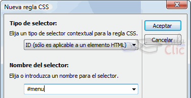 - Elige el Tipo de selector ID, y como Nombre #menu, y pulsa Aceptar.