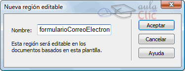 En la nueva ventana hay que establecer un Nombre para la región editable.