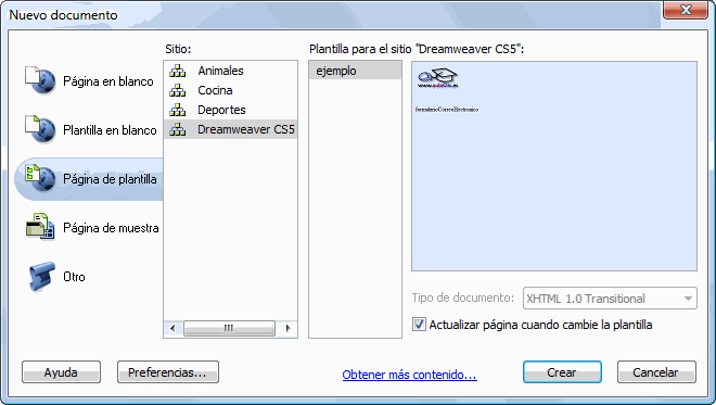 Es recomendable activar la casilla Actualizar página cuando cambie la plantilla, para que la página se actualice automáticamente en el caso de modificar la plantilla en la que se basa.