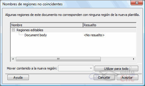 A pesar de estar trabajando sobre un documento vacío, es posible que al aplicar la plantilla aparezcan nombres de regiones no coincidentes entre el documento en blanco y la plantilla. En ese caso se muestra una ventana como la siguiente.