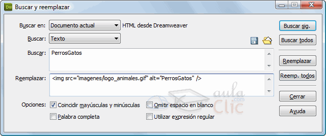 En Reemplazar con, habría que especificar la etiqueta HTML completa para insertar la imagen. En este caso la etiqueta sería <img scr="imagenes/logo_animales.gif" alt="PerrosGatos" />, teniendo en cuenta que la imagen se llama logo_animales.gif y que se encuentra dentro del sitio en la carpeta imagenes.
