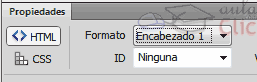Selecciona la primera línea de texto. En el inspector de propiedades pulsa HTML y aplica el formato Encabezado 1 (h1) seleccionando el valor Encabezado1 del cuadro Formato.