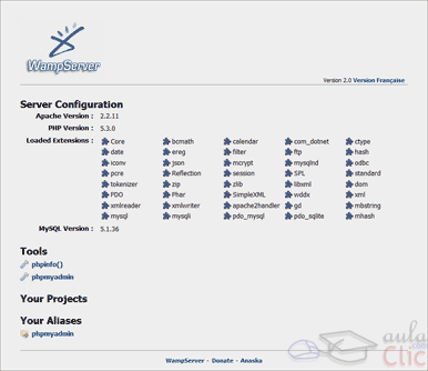 Verás que una vez instalado WAMP podremos acceder a nuestro servidor local escribiendo en la barra de direcciones del navegador http://localhost/. Se mostrará una pantalla parecida a ésta, con información sobre la versión: