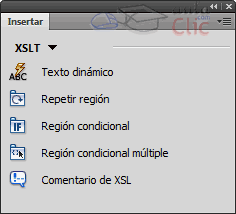 Cuando estemos en una página o fragmento XSLT, el panel Insertar nos permitirá utilizar las herramientas para trabajar con XSLT: