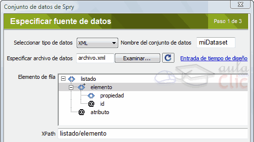 <script type="text/javascript"> var miDataSet = new Spry.Data.XMLDataSet("archivo.xml", "listado/elemento"); </script>