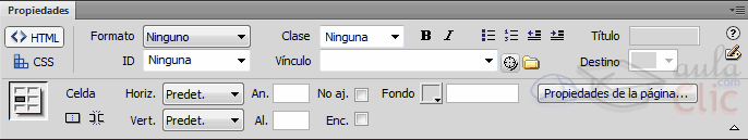 La parte superior del inspector de propiedades nos permite alternar entre las propiedades HTML, que en este caso sirven para especificar las propiedades del texto que se insertará dentro de la celda (o celdas) seleccionada, y la propiedades CSS para definir los estilos.