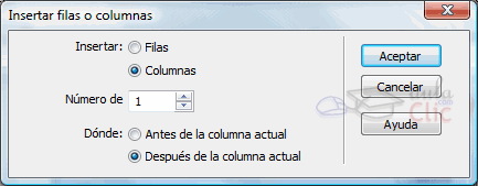 También tenemos una opción más completa, la opción Insertar filas o columnas.... Al seleccionarla aparece una nueva ventana, donde es posible determinar si lo que se insertarán serán filas o columnas, el número de ellas que se insertará, y la posición donde se insertarán.
