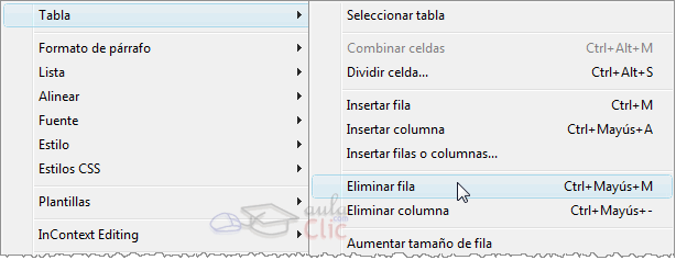 Para eliminar una fila o una columna, hay que posicionar el cursor en la fila o columna a eliminar y elegir la opción Eliminar fila o Eliminar columna del menú Tabla.