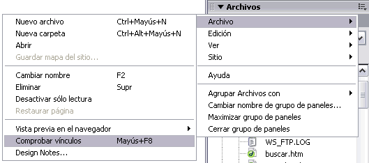 | Los Vínculos rotos son vínculos que no siguen una ruta válida, o que enlazan a archivo que no existe. La existencia de estos vínculos en nuestras páginas no es nada recomendable, ya que no permite navegar correctamente a los usuarios por nuestro sitio, se producen errores. Los servidores de tipo UNIX/Linux distinguen entre mayúsculas y minúsculas. Asi, por ejemplo, si enlazas a un archivo Perros.htm puede que el servidor no lo encuentre porque en realidad lo hayas llamado perros.htm (en minúsculas). Trabajando con Windows este tipo de errores no se presentan porque no hace esta distinción. En el ejemplo anterior Dreamweaver consideraría el enlace Perros.htm correcto aunque no lo fuese. Para evitar esto puedes activar la opción Usar verificación de vínculos entre mayúsculas y minúsculas que se encuentra en la ventana de Definición del Sitio, pestaña Avanzadas y categoría Datos Locales. Para comprobar si nuestro sitio tiene Vínculos rotos hay que abrir el Verificador de vínculos. Una forma de abrirlo es a través del panel Archivos. Ya sabes que el panel Archivos se puede abrir a través del menú Ventana, opción Archivos. También pulsando F8. Una vez abierto el panel Archivos,