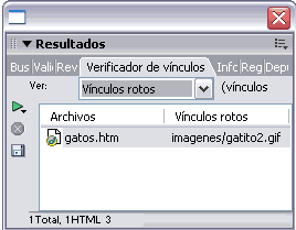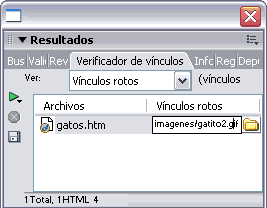 el botón A través de Ver hay que especificar si han de mostrarse los Vínculos rotos, los Vínculos externos o los Vínculos huérfanos. Los Vínculos rotos son los vínculos que no siguen una ruta válida, o que enlazan a archivo que no existe. |