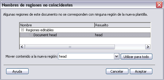 En ella hay que establecer una correspondencia entre el nombre de la región del documento vacío con el nombre de alguna región de la plantilla. En este ejemplo, la región del documento vacío que no coincidía con el nombre de ninguna región de la plantilla era la región Document head. A través de Mover contenido a la nueva región: se ha seleccionado la región head de la plantilla, para establecer así la correspondencia que se necesitaba. |