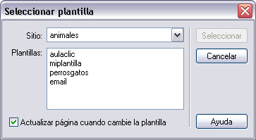 | Es preferible que antes de hacer esto nos aseguremos de que el sitio que se encuentra abierto en Dreamweaver es el mismo en el que vamos a guardar el documento, y el mismo en el que se encuentra la plantilla en la que queremos basarlo. Después de pulsar sobre la opción Aplicar plantilla a página aparece una ventana como la de la derecha, en la que hay que seleccionar una de las plantillas de la lista Plantillas: del sitio. Es recomendable activar la casilla Actualizar página cuando cambie la plantilla, para que la página se actualice automáticamente en el caso de modificar la plantilla en la que se basa. |