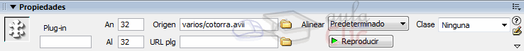 Los vídeos también se reproducen automáticamente al cargarse la página, y se reproducen solamente una vez. Estos valores pueden cambiarse a través del código, del mismo modo que en el caso de los archivos de audio, añadiendo autostart="false" y loop="true". Todos los objetos insertados a través de la opción Plug-in precisan que el usuario tenga instalado un reproductor o un plug-in apropiado para reproducirlos. En el campo Origen del inspector de propiedades se establece el archivo vinculado (el archivo de audio o de vídeo) que ha de reproducirse. En el caso de que el usuario no tenga instalado ningún plug-in adecuado, puede establecerse en el campo URL plg una página en la que pueda encontrarlo.