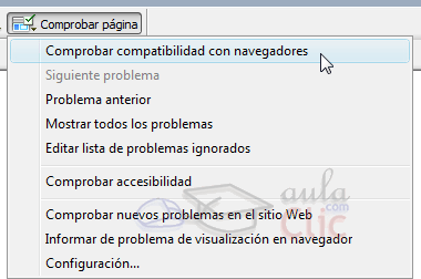 A continuación se abrirá el panel Resultados con las lista de los errores encontrados. En esta lista aparece el grado de importancia del error representado mediante un icono, el globo de palabras indica un mensaje informativo (señala código que no es compatible con un navegador pero que no tiene ningún efecto visible), el icono de signo de exclamación con fondo rojo indica error (indica código que puede causar un problema visible grave en un navegador concreto, como hacer desaparecer partes de una página) y el icono de signo de exclamación con fondo amarillo indica advertencia (señala una parte de código que no se visualizará correctamente en un navegador concreto, pero eso no causará ningún problema grave de visualización). A continuación tenemos la página y número de línea donde está el error y una descripción del mismo. A veces la descripción es un texto largo que no se puede visualizar completamente para ello puedes utilizar el botón Más info Como ya sabrás los distintos navegadores y sus distintas versiones hacen que un error lo sea o no, debemos realizar la comprobación eligiendo las versiones de los navegadores que consideremos sean las más utilizadas entre nuestros navegantes. Para comprobar la compatibilidad de la página web que hayas creado puedes utilizar el desplegable Comprobar página. Despiégalo y haz clic sobre la opción Comprobar compatibilidad con navegadores:
