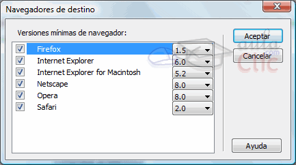 Donde podras indicar que navagadores y a partir de qué versión quieres que se tengan en cuenta cuando Dreamweaver realiza la comprobación de compatibilidad. |