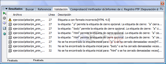 Otra forma de detectar errores en nuestra página es a través del menú Comprobar navegadores de destino en la barra de herramientas Documento. Para ver los errores que tiene nuestra página, desplegamos el menú A continuación se abrirá el panel Resultados con las lista de los errores encontrados.