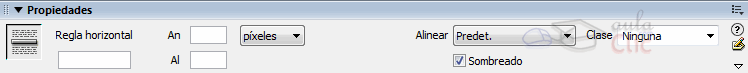 | El elemento que suele utilizarse para separar secciones dentro de una misma página es la regla horizontal. Una regla horizontal no es más que una línea horizontal. Para insertar una regla hay que dirigirse al menú Insertar, opción HTML, luego la opción Regla horizontal. El inspector de propiedades para las reglas es el siguiente.