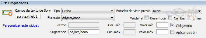 El objeto de campo de texto es exactamente igual al que vimos en la unidad de formularios. Haciendo clic en la etiqueta azul Campo de texto de Spry podrás ver las opciones de validación en el panel Propiedades: