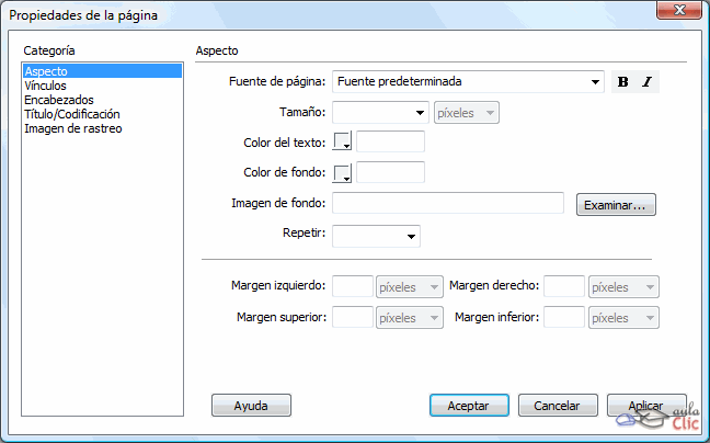Imagen de fondo: permite especificar una imagen de fondo para el documento. Dicha imagen se muestra en mosaico. Es importante al elegir una imagen de fondo tener en cuenta que según los colores de la imagen será necesario establecer unos u otros colores para el texto, así como que no es conveniente tener un gif animado como fondo. Color de fondo: permite especificar un color de fondo para el documento, pero dicho color solo se mostrará en el caso de no haber establecido ninguna imagen de fondo. Tamaño: permite definir el tamaño de la letra. Color del texto: es el color de la fuente. Márgenes: permiten establecer márgenes en el documento. Los márgenes izquierdo y superior solo funcionan en Microsoft Internet Explorer, mientras que el ancho y el alto de márgen solo funcionan para Netscape Navigator. Ninguno de estos márgenes aparece en la ventana de documento de Dreamweaver, solo se mostrarán en los navegadores.