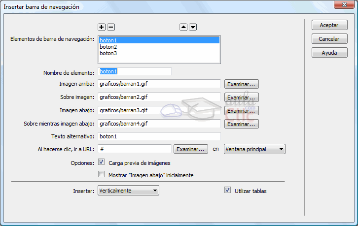 A través de la opción Insertar es posible especificar si los botones de la barra de navegación