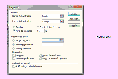 Usemos la secuencia: [Datos] - [An álisis de datos] - [Regresión] - [Aceptar] La ventana que se obtiene debemos completarla de la siguiente manera: