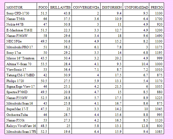 En edición de la revista MacUser aparecieron los siguientes datos acerca de las características necesarias para que un usuario pueda seleccionar el monitor adecuado para su sistema de cómputo. Para las características de foco y brillantez, las calificaciones más altas indican mejor calidad. Para la falta de convergencia, distorsión y uniformidad, las calificaciones menores indican mejor calidad. Haga un análisis de los datos y realice una estimación lineal para determinar el precio del monitor.