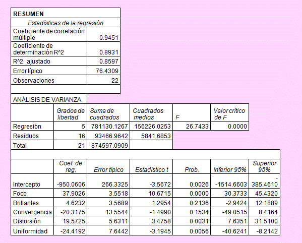Precio = -950.06 + 37.9026Foco + 4.6232Brillantes -20.3175Convergencia + 19.5725Distorsión – 24.4192Uniformidad
