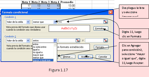 - El primer cuadro de lista debe estar en [Valor de celda]; en el segundo se debe seleccionar “Menor que”; digitar 11 (para los desaprobados)