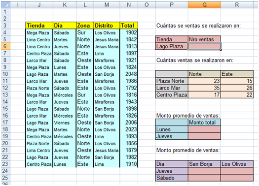 Según la tabla, en la celda Q24 debemos hallar el promedio de todas las ventas realizadas el día jueves en el Distrito de San Borja. Esto se logra con la fórmula:
