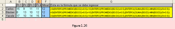 Dado el siguiente segmento de hoja, mostrado en la figura 1.26, la nota final (columna F), se debe obtener de la siguiente manera: Si el promedio de las tres primeras notas es aprobatoria, este promedio es la nota final; en caso contrario, el promedio final se debe obtener tomando en cuenta la cuarta nota pero eliminando la nota más baja.