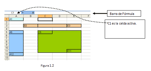 La celda que está seleccionada constituye la celda activa. En la figura 2 la celda activa es la celda C1. Esto se muestra a la izquierda de la barra de fórmula, éste espacio recibe el nombre de Cuadro de nombres. Si la celda seleccionada fuera B4, en el cuadro de nombres aparecería B4.