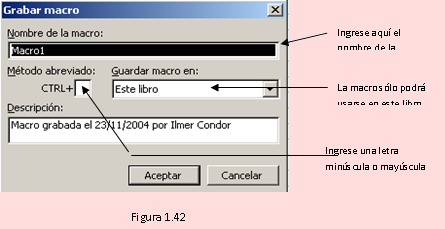 Use la siguiente secuencia: [Vista] - [Macro] - [Grabar nueva macro]. Obtendrá una ventana de diálogo similar a lo descrito líneas arriba.