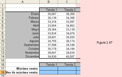 b) Suponga que en la celda B17 se desea tener la máxima venta del rango B3:B14, correspondiente a la Tienda 1. Entonces en B17 se debe ingresar =Max(B3:B14). Si en B18 se desea el mes de máxima venta, se deberá digitar: